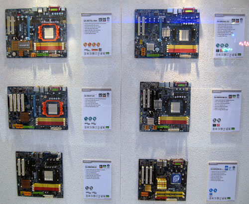 Gigabyte hat ebenfalls eine ganze Fülle an neuen Mainboards präsentiert, die zum größten Teil mit hochwertigeren Kondensatoren bestückt werden, um die Haltbarkeit der Boards auch bei hohen Ansprüchen zu verbessern. Dies kennzeichnet Gigabyte mit dem Kürzel „DS“ in der Produktnummer und heißt soviel wie Solid Capacitor Design.