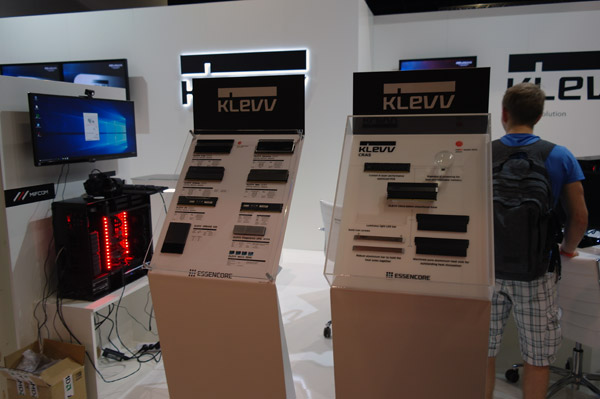 Gezeigt wurden die KLEVV Cras DDR4, KLEVV Urbane DDR3, KLEVV Genuine DDR3, KLEVV Neo DDR3, KLEVV Fit DDR3 und sogar eine KLEVV Urbane SSD, KLEVV Fingerprint UFD und KLEVV Micro SDHC Karten von 8GB bis 64GB.