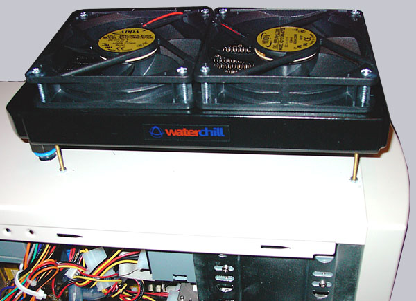 Der Radiator muß jederzeit mit frischer Luft versorgt werden und da der DUAL-Radiator ziemlich schlecht in einen Midi-Tower passt, habe ich mich bei diesem Test-PC dazu entschieden, den Radiator mittels 4 Schrauben auf das PC-Gehäuse zu schrauben.