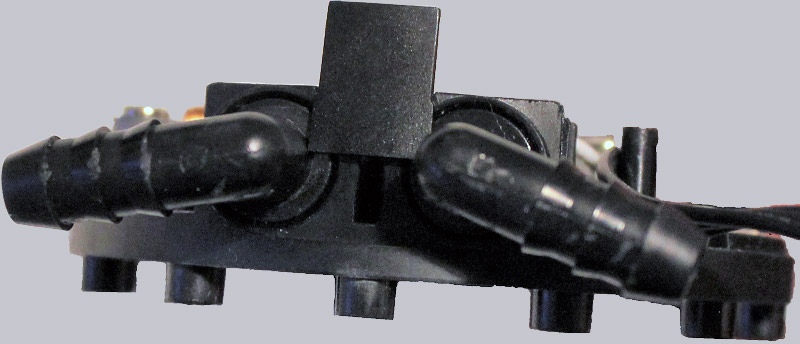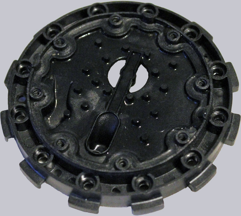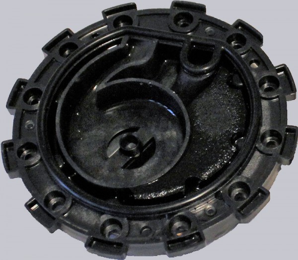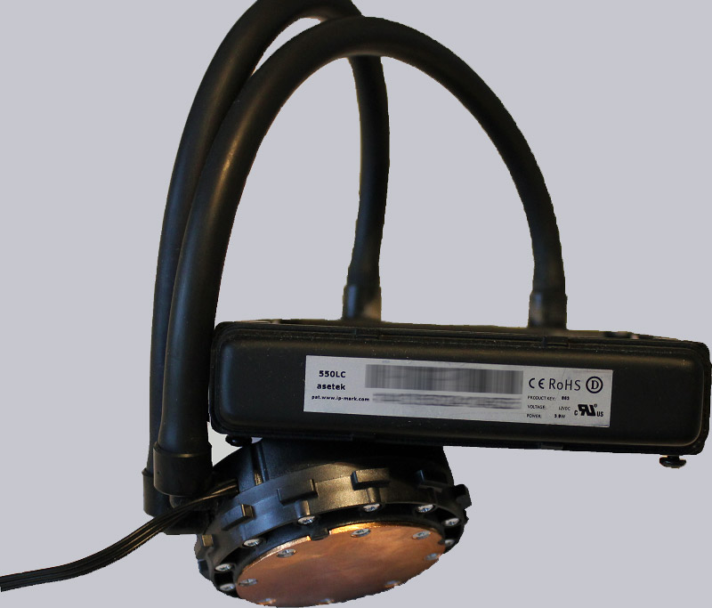 We see the small hole in the middle of the center where the pump pushes the “fresh” water through the very fine copper fins. Then it comes out heated at the side and leaves the radiator / pump unit in the direction to the radiator, which can dissipate the absorbed heat by the fan to the environment. The cooled water leaves the radiator in the direction of the pump, etc.