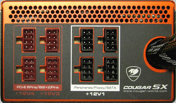 The Cougar SX power pack is build modular, as already mentioned on the first page and provides thanks to individually connectable cables a cleared up PC for a better aeration and/or heat dissipation from the PC case. Additionally cables are contained in different types and lengths, so that an optimal conntection of the respective power consumer should be possible. All connections are well finished and offer a safe contact. On the power supply one can see very well, over which rails one get the +12V voltage, whereby the Cougar SX700 offers a dynamic 12V distribution of load, which gives the highest achievement automatically to the most loaded rail. By the way Cougar did not miscount +12V1, +12V3 and +12V4, but the +12V2 line is already connected over the non-modular cables with the power supply.
