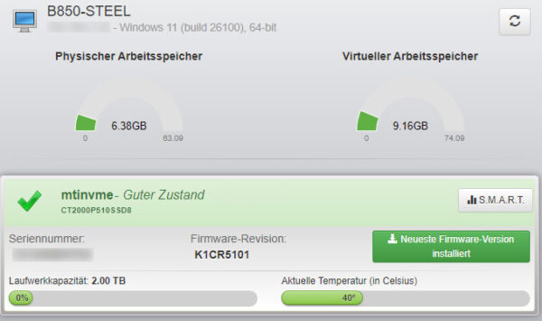 Before we start, we use the Crucial Storage Executive software to check whether everything is OK with the SSD and whether new firmware is available for the P510 SSD.