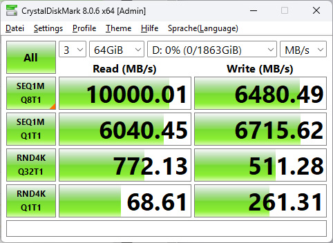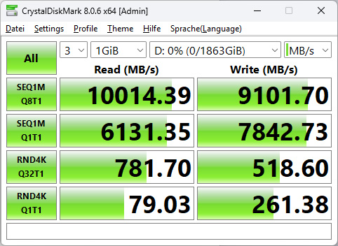 Once no problems have been detected and the latest firmware has been installed, we start the performance tests. We start the Crystal Disk Mark with 1GB file size and 3 passes. The Crucial P510 even slightly exceeds the transfer rates promised by Crucial. The P510 achieves an excellent 10,014 MB/s for sequential reads and an excellent 9,101 MB/s for sequential writes. The P510 also achieves very good values for random 4K read and write accesses.