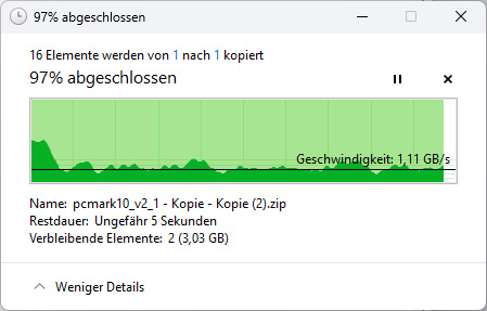 When copying several hundred GB of installation data, the transfer rate settles at an average of approx. 1,100 MB/s after a short time.