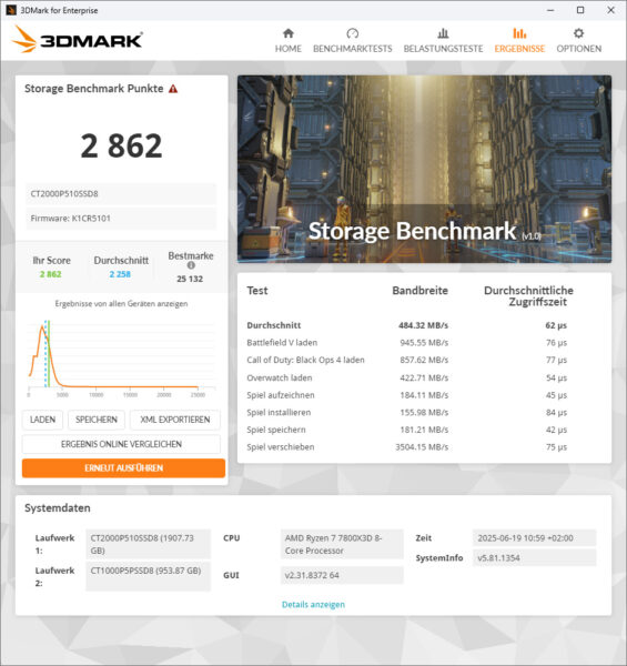 Finally, we run the storage benchmark from 3D Mark, where extensive tests are carried out that simulate the installation of games and saving of game states, among other things. The overall result with an average of 484 MB/s and 62 microseconds access time is also excellent. The graph on the left shows that we are dealing with an above-average fast SSD. This means that the Crucial P510 is also ideally suited for gaming PCs.