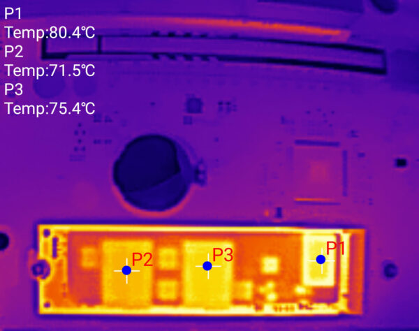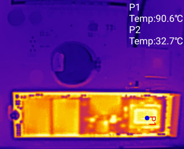 Since PCIe 4.0, heat generation has also been an important issue for M.2 SSDs. If an SSD runs hot, its speed is automatically throttled to protect it from heat damage. Crucial specifies a critical temperature of 85°C for the P510. During our extensive and endurance tests, the P510 reached a maximum temperature of 65°C at a summer ambient temperature of 27°C, according to the internal sensors evaluation, which meant that throttling due to excessive temperature was still a long way off. The new Phison controller is thus significantly more frugal than its predecessors, which struggled with poorer efficiency or were designed for pure performance. For an efficiency comparison, we finally subjected the Crucial P5 Plus Gen4 SSD and the P510 to intensive stress under the same conditions and took a thermal image of the SSDs without heat sinks. The P5 Plus controller reached a temperature of 90°C and the memory chips reached approximately 80°C.
