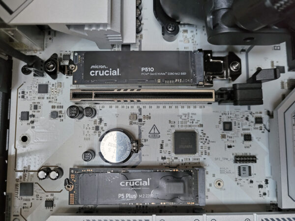 Thanks to quick-release fasteners, the Crucial P510 SSD can be placed in the upper M.2 slot of the ASRock B850 Stell Legend motherboard in no time at all. We place a Crucial P5 Plus 1TB PCIe 4.0 SSD in the lower slot for comparison purposes.