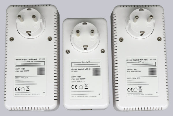 The design of the devolo Magic 2 WiFi next and devolo Magic 2 LAN powerline adapters is a simple white without a lot of frills, so that an inexperienced eye could mistake the adapters for a timer or wireless socket from devolo. The small lettering next to the large devolo logo and the LAN connection at the bottom, of course, tell us immediately what we have in front of us. In addition, the front of both devolo WiFi next adapters has an illuminated home and WLAN button and a small hole on the underside as a reset button. The LAN adapter also has a pairing reset button on the side.