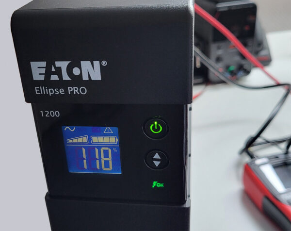 Eaton specifies a maximum UPS output of 750 watts for the Ellipse Pro 1200VA. But what actually happens if the UPS is overloaded? We tested it, of course, and were even able to operate a device with 900 watts during normal mains operation without any problems. Only the display kindly pointed out to us that we were operating a device with 18% too high a power requirement.