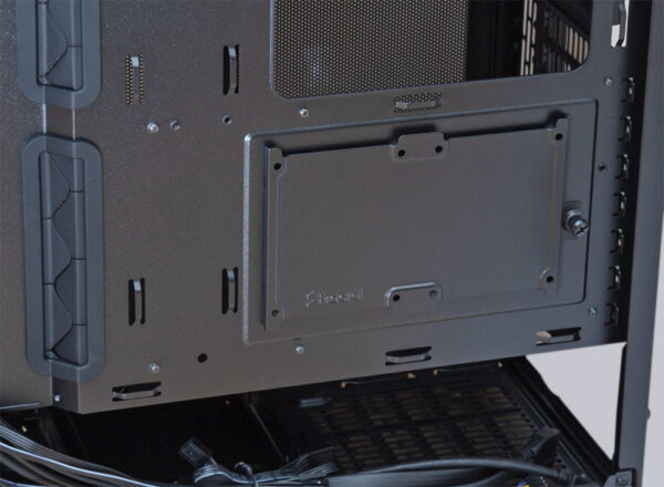 Behind the second side cover, there is enough space to really let off steam when laying cables. Numerous eyelets and cable ties with Velcro are available. Underneath the large clearance for the motherboard’s backplate is a holder for two 2.5″ drives.