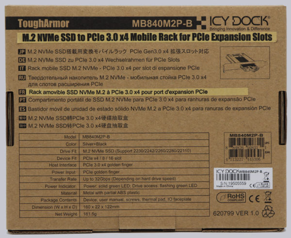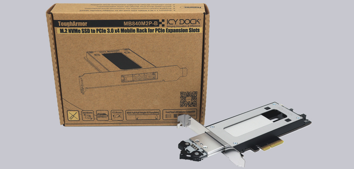 Icy Dock has just released another new product from the ToughArmor series, which we are already testing on OCinside.de. Just recently we had a look at the Icy Dock ToughArmor MB839SP-B PCIe card for use with 2.5-inch SATA drives and now there is an interesting solution with the Icy Dock MB840M2P-B PCIe slot card to install an M.2 PCIe NVMe SSD in a PCIe 3.0 x4 slot. We have tested this extraordinary PCIe card with removable M.2 NVMe frame extensively and show the results including thermal image and 360 degree view in the following review.