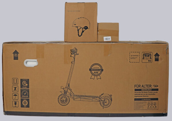 The iScooter T4 was delivered in this packaging, and we opted for the set with combination lock, bag and LED helmet. So you no longer have any excuse for riding without a helmet 😉