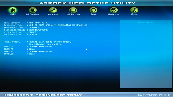 The ASRock UEFI BIOS of the A75 Pro 4 offers a graphical surface for an intuitive operation with a mouse or with a keyboard, depending upon desire. User with an USB mouse and USB keyboard should not deactivate the Legacy USB support in the BIOS with the USB Configuration, because otherwise they can’t access the UEFI Setup. In the Auto mode the board decides if the USB device need to operate in Legacy mode. Keyboard and Mouse should be still connected to the USB 2.0 ports.