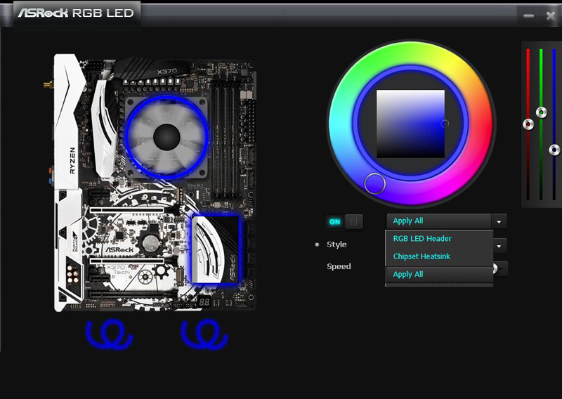 The RGB LED header and the integrated RGB LEDs are controlled by the supplied ASRock RGB LED software. Currently there’s no RGB setting in the UEFI like known e.g. from Z270 Killer SLI except activation and deactivation. But the ASRock RGB LED Software menu offers a lot of variations like e.g. different colors.