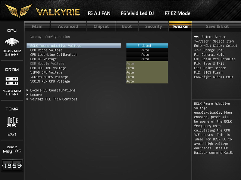 In the Tweaker overview page, we can adjust the “Base Clock” of the processor, as well as make changes to the multipliers of the cores. The motherboard differentiates between the performance cores and the efficiency cores, so both can be overclocked or underclocked independently of each other.
