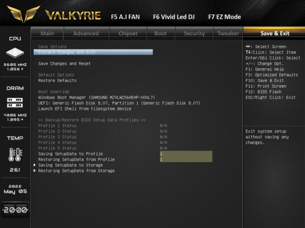 The last remaining menu item is Save & Exit. As you would expect, this is where you can save all the settings you have made in UEFI. Those who do a lot of overclocking will be happy that Biostar provides the motherboard with 5 profiles to save different configurations.