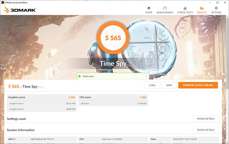 Then we run the benchmark again, but this time it is calculated by the Radeon 5700 XT again, but output on the laptop internal display. Due to the additional data traffic over the Thunderbolt connection, the result drops to 5565 points.