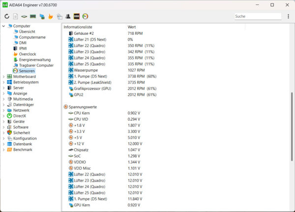 Let’s first measure the voltages in idle mode. If the PSU does not reach its nominal voltages at this point, it will be difficult to maintain the 5%+ deviations required by Intel under load. We were astonished that the voltages correspond quite exactly to the nominal voltages. Of course, this could also be due to the motherboard’s very good voltage regulation. However, if we look at the voltage values of the Quadro fan controller, which is connected directly to the PSU via Molex, this confirms the very good values of the PSU. We notice that we should check the cable of the water pump, because there are very slight voltage losses here 😉