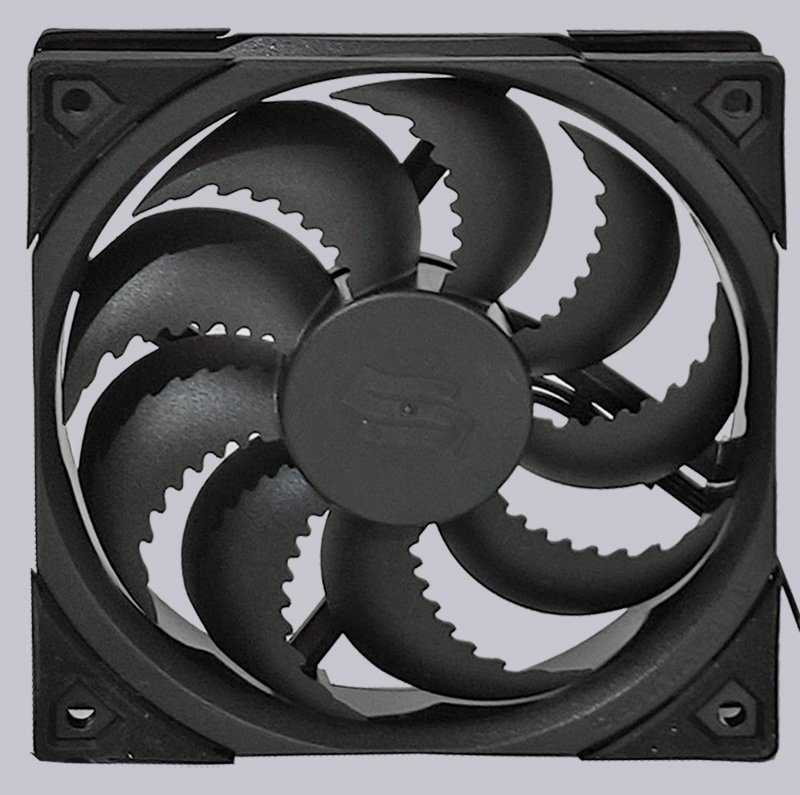 The Fluctus 120 PWM fans are pure black with heavily profiled fan blades. Soft vibration dampers are installed at the corners. The 20cm long PWM connection cable is extended by a 13cm cable with PWM socket, with which several fans can be connected in series and thus both fans can also be connected together to the CPU_FAN connector of the mainboard. The fans control the SilentMode – at 0% PWM signal the fans stand completely still.