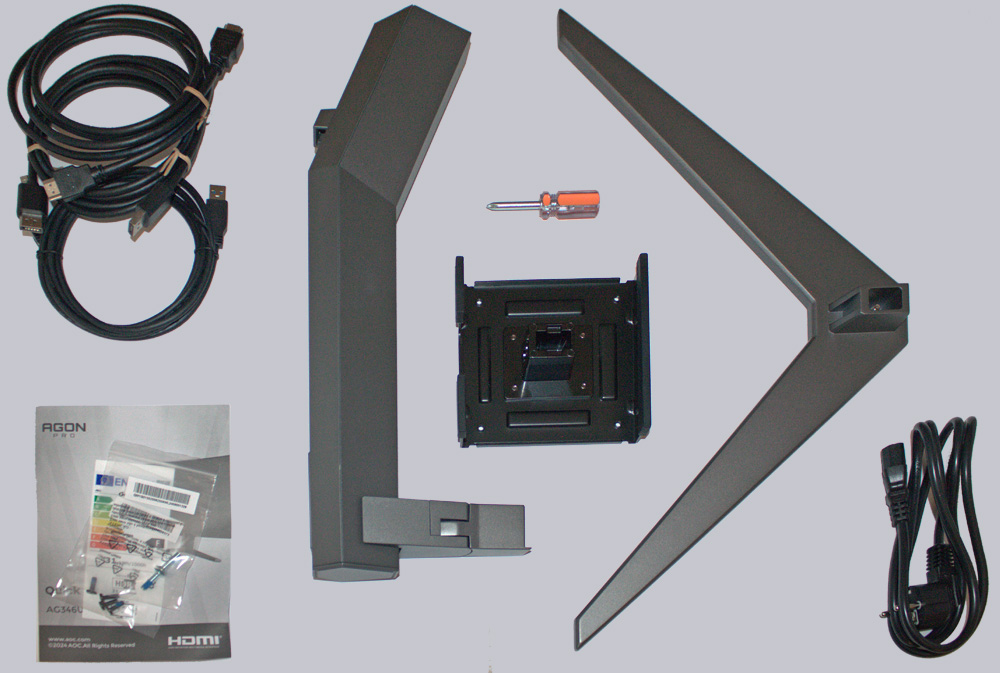 … finden wir folgende Komponenten: Ein Handbuch, ein HDMI Kabel, ein Display Port Kabel, ein USB Kabel, ein Strom Kabel, den zweiteiligen Standfuß sowie einen Schraubendreher, die VESA Halterung und ein paar Schrauben zur Befestigung.