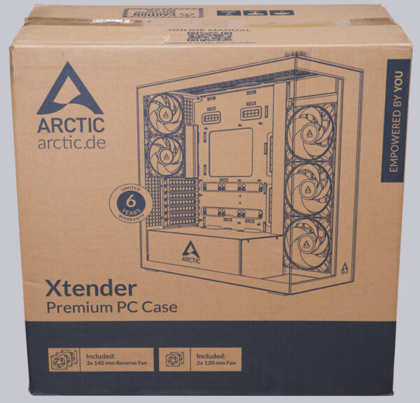 Geliefert wird das Arctic Xtender Gehäuse in einem stabilen Karton, der außen einfarbig bedruckt ist und die wichtigsten Merkmale des Gehäuses zeigt, sowie QR-Codes zur Produkt- und Supportseite aufweist.