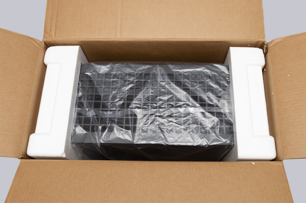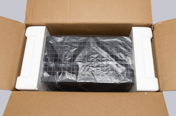 Ausreichend großer Abstand zur Kartonwand schützt das Gehäuse bei kleineren Beschädigungen des Kartons, die beim Transport immer wieder vorkommen können.