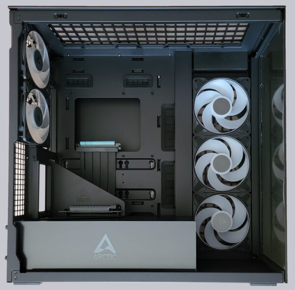 Das Arctic Xtender Case nimmt sämtliche Desktop Mainboards von Mini-ITX bis E-ATX und bis zu 285mm Breite problemlos auf. Dank seiner großen Höhe von 53cm bietet es besonders oberhalb des Mainboards großzügig Platz für Radiatoren bis 420mm Größe oder drei 140mm Lüfter. Rechts neben dem Mainboard-Tray hat Arctic beim Xtender Case bereits drei 140mm große Hochleistungs-Reverse-Lüfter mit A-RGB Beleuchtung vorinstalliert. Sie rotieren bis zu 2650 U/min schnell und saugen massenhaft Frischluft von der Hinterseite durch ein Staubschutzgitter an. Statt den Lüftern kann rechts ebenfalls ein bis zu 420mm großer Radiator montiert werden. Wer jedoch lieber einen Luftkühler für seine CPU verbaut, kann auch hier aus dem Vollen schöpfen, denn bis zu 171mm große Luftkühler passen in das Xtender Gehäuse. Abgeführt wird die Luft über zwei vorinstallierte P12 Pro A-RGB Lüfter deren Drehzahlband von 600 bis stürmische 3000 U/min reicht. RGB-LEDs hat das Xtender Case an allen fünf Lüftern integriert und das Arctic Logo in der Acrylplatte vor der Netzteilabdeckung wird ebenfalls von 24 RGB-LEDs illuminiert.