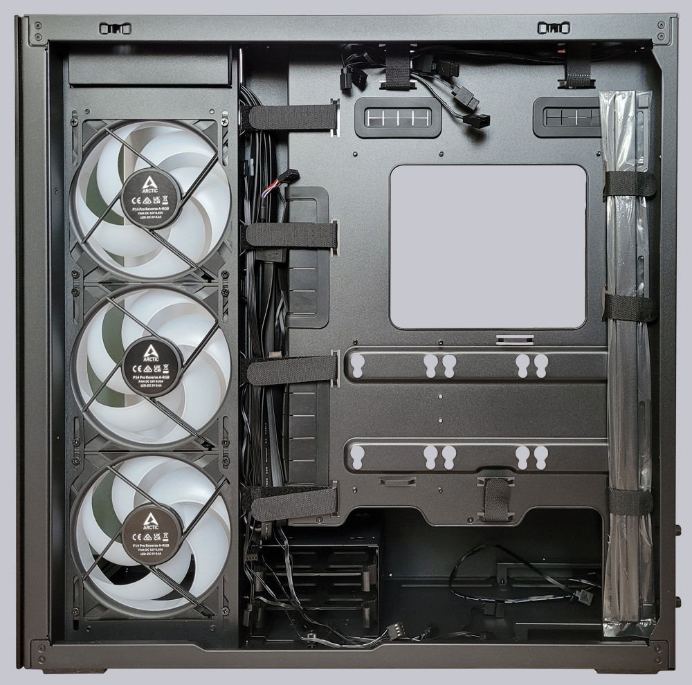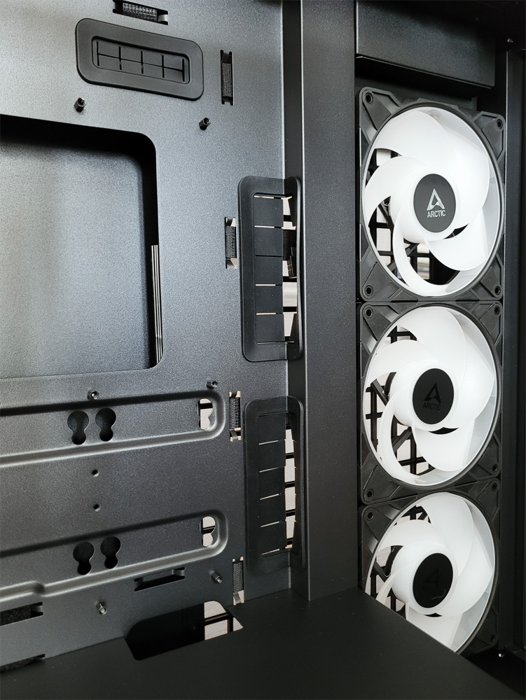 Bei der VG-Variante ist zudem eine vertikale Grafikkarten-Halterung vormontiert, die für Übertragungsraten bis PCIe 4.0 x16 freigegeben ist. Sie kann mit wenigen Handgriffen entfernt werden, falls man die Grafikkarte konventionell in den PCIe-Slot des Mainboards stecken möchte. Eine Grafikkartenstütze muss man bei konventioneller Montage jedoch selbst organisieren. Rund um das Mainboard befinden sich große Öffnungen, um Kabel von der Rückseite durchzuführen. Nahezu bündig schließen die kraftvollen 140mm Reverse Lüfter mit dem eingelassenen Kabelkanal rechts neben dem Mainboard ab. Montiert man einen Radiator statt den Lüftern, muss beachtet werden, dass dieser deutlich vor das Mainboard ragt und den Einbau der Grafikkarte behindern kann.