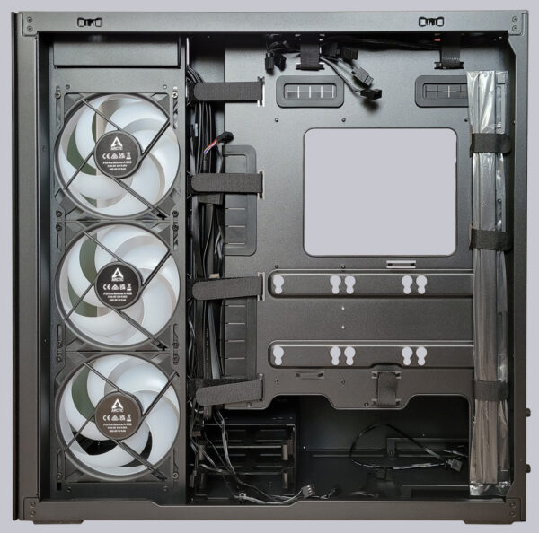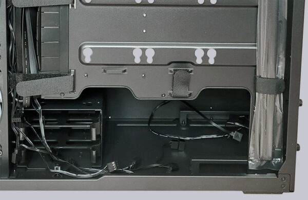 Auf der Rückseite sind die Kabel der Lüfter und für die Front-I/O Buchsen bereits sauber verlegt und für die restlichen Kabel sind etliche Klettbänder für eine ordentliche Kabelverlegung vorab angebracht worden. Rechts wurde auch noch eine zweite Adapterleiste zur Montage von 120mm Lüftern verstaut. Der Festplattenkäfig kann zwei 3,5″ Festplatten oder drei 2,5″ Laufwerke aufnehmen oder auch komplett entfernt werden. Leider liegt der HDD-Käfig nicht im direkten Luftstrom der Gehäuselüfter, weshalb man bei exzessivem Einsatz von HDDs, die Temperaturen im Blick behalten sollte. Drei weitere 2,5″ Laufwerke finden zusätzlich hinter dem Mainboard Platz, wo sie mit den mitgelieferten Gummielementen aufgehängt werden können.