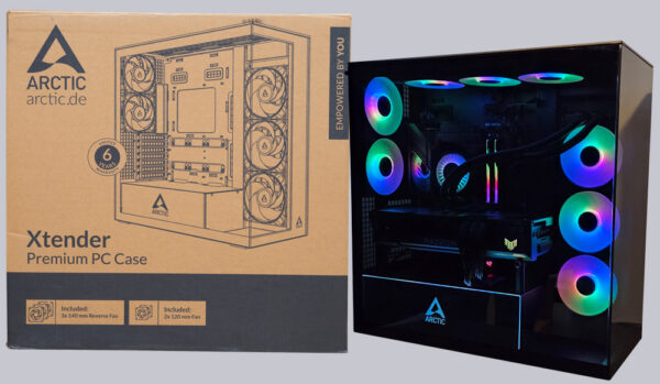 Wer das berücksichtigt, bekommt mit dem Xtender Case ein hochwertiges PC-Gehäuse mit fünf Hochleistungs-A-RGB-Lüftern wovon drei sogar als Reverse-Lüfter ausgeführt sind. Würde man die Lüfter und einen GPU-Riser für vertikale Grafikkartenmontage separat kaufen, müsste man bei den meisten Anbietern schon mehr bezahlen, als für ein Arctic Extender VG Gehäuse mit genau diesem Zubehör. Insofern relativiert sich der Preis sehr schnell, wenn man die gesamte Ausstattung in Betracht zieht.