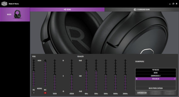 Für das Feintuning des Sounds und Steuerung der RGB Effekte am MH650 stellt Cooler Master die Master Plus Software kostenlos zur Verfügung. Die intuitiv bedienbare Anwendung beschränkt sich glücklicherweise auf das Wesentliche und bietet auf der ersten Seite die Möglichkeit die Pegel der Lautsprecher und vom Mikrofon zu justieren und einen 5-Band Equalizer für die Feinabstimmung des Sounds. Für die bestmögliche Anpassung des Sounds sind die 5 Frequenzbereiche aber nicht gerade üppig, weshalb wir empfehlen, eher den in Windows integrierten Equalizer zu verwenden, da dieser ganze 10 Frequenzbereiche bietet.