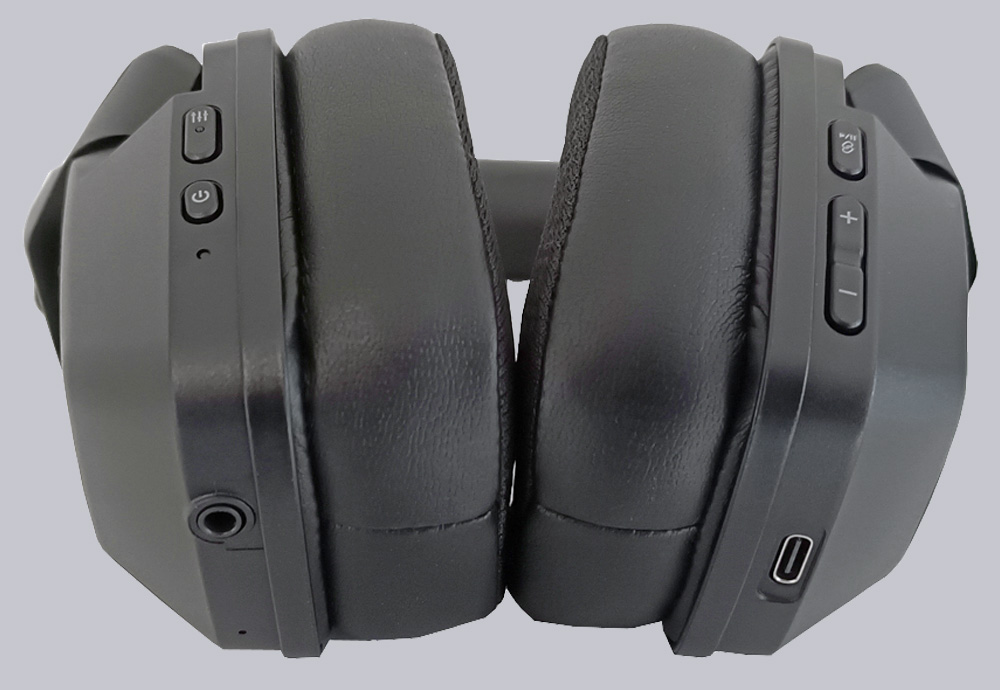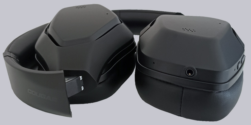 Links oben auf dem Bild befindet sich eine Umstellmöglichkeit für verschiedene Modi. So kann zwischen einem „normalen“ Betrieb und ANC (Active Noise Cancelling) umgeschaltet werden. Hinzu kommt die Option, Außengeräusche sogar bewusst zu verstärken und somit zum Beispiel Arbeitskollegen noch wahrzunehmen, die einen ansprechen. Cougar nennt dies Ambience Amplify. Oben rechts befindet sich ein Pairing Button für Bluetooth 5.0.