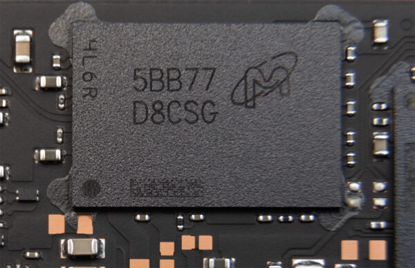 Dem Controller stehen 2GB DDR4 mit 4266MT/s zur Seite, die sich auf einem einzelnen Chip zwischen Controller und den Speicherbausteinen befinden. DDR4-Cache sorgt für kürzeste Reaktionszeiten bei kleinen Schreibvorgängen und optimiert die Leistungsfähigkeit der SSD.