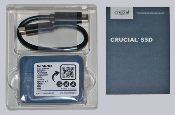 In dem kleinen Karton befindet sich ein Booklet, ein 15 cm langes USB-C auf USB-C Kabel sowie die Crucial X10 Portable 2TB SSD.