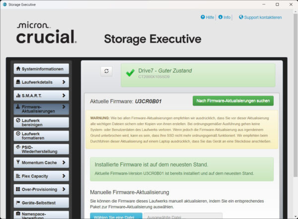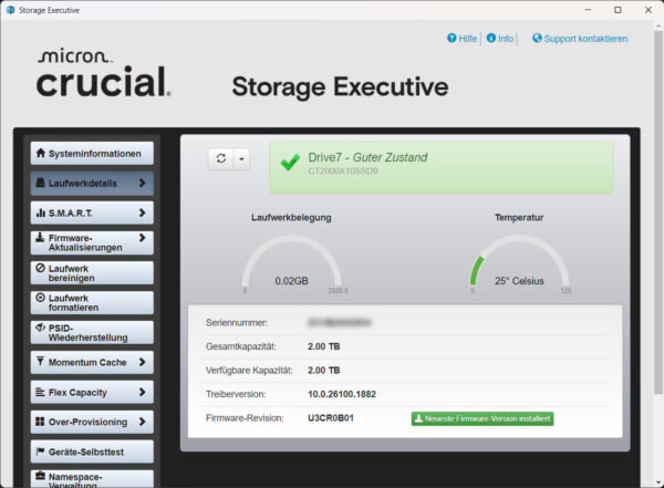 Mit dem Crucial Storage Executive Tool könnte man die Firmware der SSD bei Bedarf relativ einfach aktualisieren, dennoch sollte man wie immer vor einem Firmware Update alle wichtige Daten sichern.