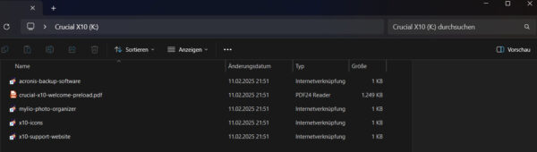 Als wir die SSD öffneten, sahen wir bereits enthaltene Daten, die Crucial dort platziert hat. Zwei Links zu Acronis Backup Tool und mylio Photo Organizer und eine Produkt PDF sowie links zur Crucial Seite.