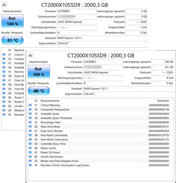 Auch hier sind die Testergebnisse recht überschaubar. Im Leerlauf erreicht die SSD gerade mal 31 °C. Nach einem Lese-/Schreibtest mit großen Datenmengen erhöhte sich die Temperatur auf 40 °C.