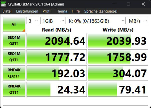 Besser geht es kaum. Die SSD hat nahezu perfekt die veranschlagte Geschwindigkeit von 2100 MB/sek sowohl beim Lesen als auch beim Schreiben erreicht.