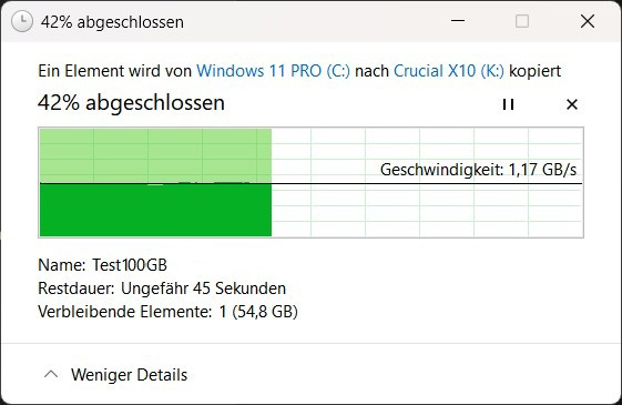 Aber das ist natürlich ein synthetischer Benchmark. Kopieren wir doch mal einigen Dateien auf die SSD und schauen wie lange das dauert. Es wurde per fsutil ein 100 GB Testfile erzeugt und zur SSD übertragen. Die durchschnittliche Geschwindigkeit lag bei 1,17 GB/Sek. Der gesamte Vorgang dauerte 1 Min und 20 Sekunden.