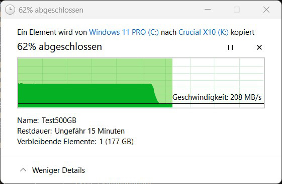 Hier macht sich die Nutzung der QLC-Zellen als SLC-Zellen bemerkbar. Nach ca. 300 GB müssen diese nämlich umgeschrieben werden, was in einem Einbruch der Datenübertragungsrate resultiert. Darüber hinaus steigert der Kopiertest auch die Temperatur.