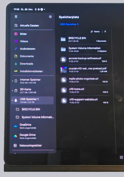 Auch die Konnektivität konnte überzeugen. Jedes Gerät wie das hier gezeigte Samsung Galaxy Tab S9 Ultra akzeptierte die SSD sofort und zeigte die gespeicherten Daten an.