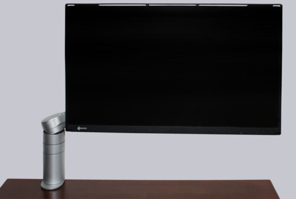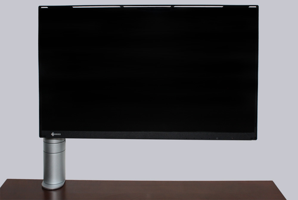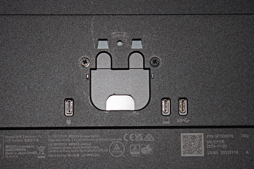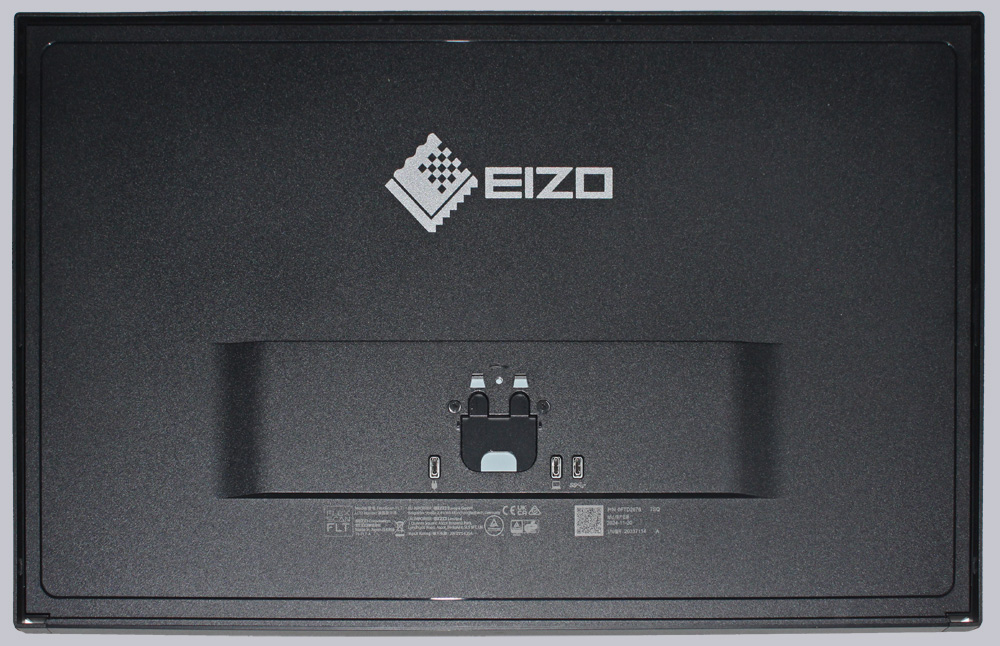 Mittig befindet sich die Aufnahme für den Monitorarm. Dieser wird zuerst in die oberen beiden Löcher eingesetzt und nach unten durch den Druckverschluss arretiert. Eine Möglichkeit zum Aufstellen besitzt der Monitor leider nicht. So ist es immer auf die Montage an einer Halterung angewiesen oder man druckt sich mit dem eigenen 3D Drucker eine feine Lösung. Es gibt auch eine optionale VESA-Platte, die man von EIZO erwerben kann. Diese lag uns zum Test jedoch nicht vor.