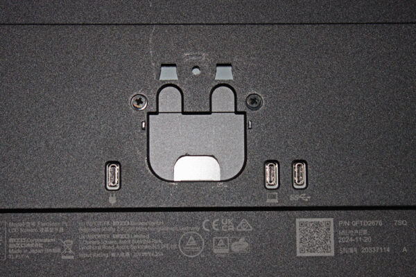Auch die Rückseite ist sehr aufgeräumt und hält eine Überraschung für uns parat. Es befinden sich lediglich drei USB-C Anschlüsse auf der Rückseite. Ein Anschluss dient zur Energieversorgung, ein Anschluss verbindet den Monitor zwecks Videosignal mit einem PC und der letzte Anschluss stellt einen USB-Port bereit um ein zusätzliches Gerät anzuschließen.