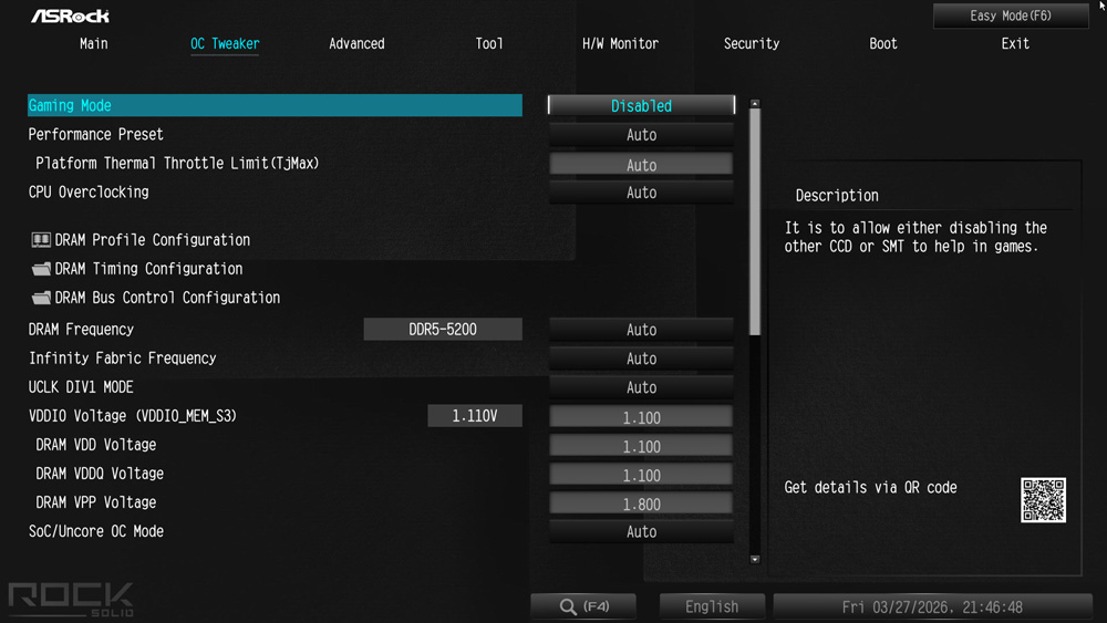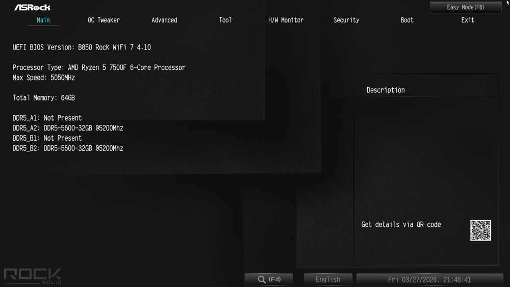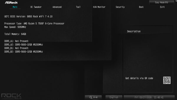 Bereits im Auslieferungszustand ist das zum Testzeitpunkt aktuellste BIOS auf dem B850 Rock Board installiert gewesen. Sowohl CPU als auch die 2x 32GB DDR5 wurden problemlos sofort erkannt. Zudem wurde der Arbeitsspeicher ohne weiteres Zutun auf die für Ryzen 7000 Prozessoren maximal zulässigen 5200MT/s eingestellt. Höhere Taktfrequenzen fallen in den Overclocking Bereich und müssen hinsichtlich Stabilität vom Anwender getestet werden.