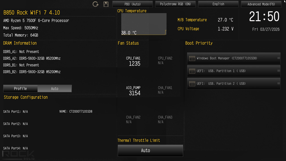 Am B850 Rock WiFi Mainboard stehen dem User sämtliche Übertaktungsmöglichkeiten zur Verfügung, die von AMD vorgesehen sind. Dazu gehört natürlich auch ein vollständiges Konfigurationsmenü zur Einstellung aller Parameter, die den Arbeitsspeicher betreffen. Vereinfacht wird die RAM-Übertaktung dank Unterstützung von EXPO als auch XMP Profilen. Mittels Precision Boost Overdrive kann die Prozessorgeschwindigkeit gesteigert und gleichzeitig dank Spannungsreduktion der Stromverbrauch gesenkt werden. Trotz Platzierung im Einstiegssegment bietet das B850 Rock WiFi 7 alle Möglichkeiten, um die höchstmögliche Performance aus Prozessor, Arbeitsspeicher und der Grafikkarte herauszuholen. Ebenso läuft unsere PCIe 5.0 SSD im neuen Rock Board ohne Einschränkung auf voller Geschwindigkeit.