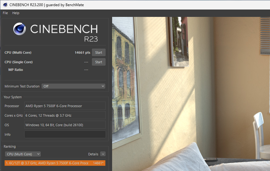 Auch wenn der AMD Ryzen 5 7500 Prozessor nicht die erste Wahl für Übertakter ist, konnten wir dennoch mittels Precision Boost Overdrive 3,9% mehr Geschwindigkeit aus dem Prozessor herausholen und erreichten 14661 Punkt im Multicorebenchmark von Cinebench R23 statt zuvor 14117 Punkte.