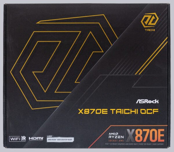 Das X870E Taichi OCF kommt in einem Karton, dessen Größe und Aufmachung ganz gewöhnlichen Mainboards im ATX Format entspricht. Lediglich die Oberfläche der Verpackung wurde durch ein samtiges Finish aufgewertet. Die Vorderseite gibt noch keinen Hinweis darauf, dass es sich hier um ein ganz besonderes Mainboard handelt.