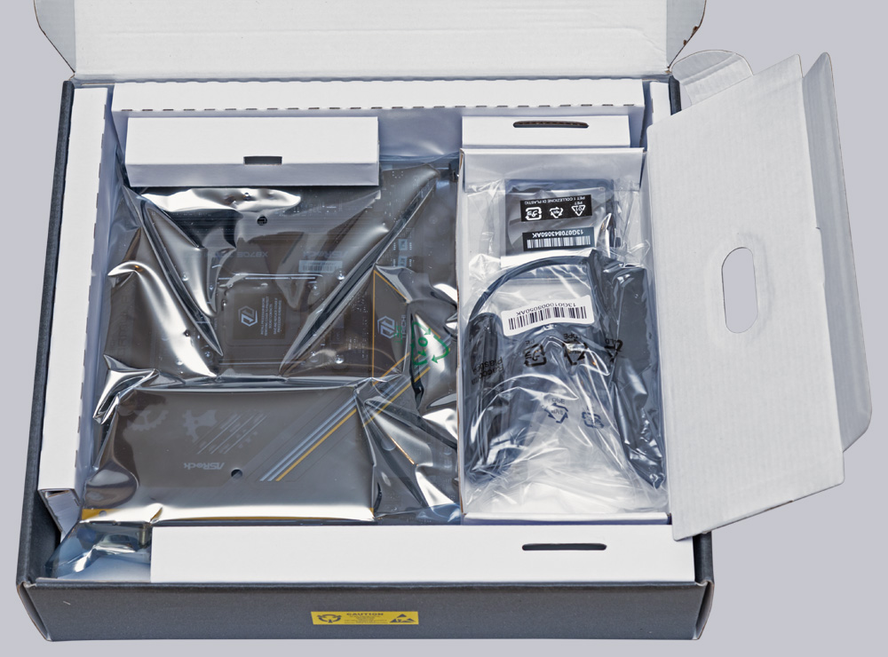 Das Mainboard ist in Antistatikfolie gepackt und rundum gut in Karton eingefasst. Rechts befindet sich eine Zubehörbox mit den W-LAN Antennen und einem RAM-Lüfter.