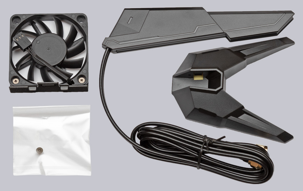 Neben dem X870E Taichi OCF Motherboard erhält man noch eine Kombiantenne für Bluetooth und Wi-Fi 7 sowie einen 60mm Lüfter zur Kühlung des RAM.