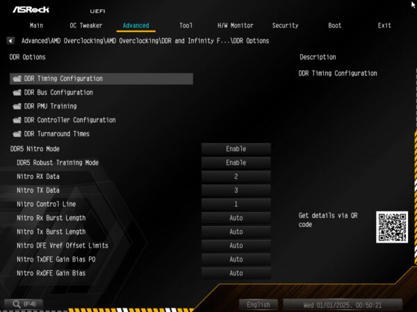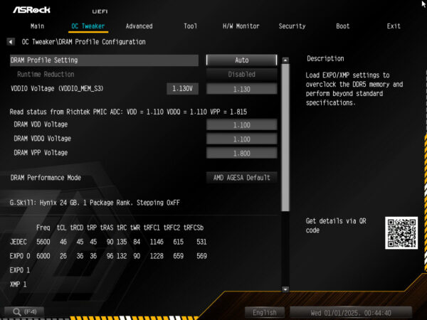 Ein vollständiges DRAM Tuning Menü darf bei einem OC-Board natürlich auch nicht fehlen, ebenso wenig wie die Möglichkeiten zur Einstellung des Infinity Fabric Taktes und die SOC-Spannung. IM DRAM Menü kann das XMP/EXPO Profil geladen werden und die für den RAM wichtigen Spannungen VDD, VDDQ und VDDIO sind ebenfalls dort zu finden.